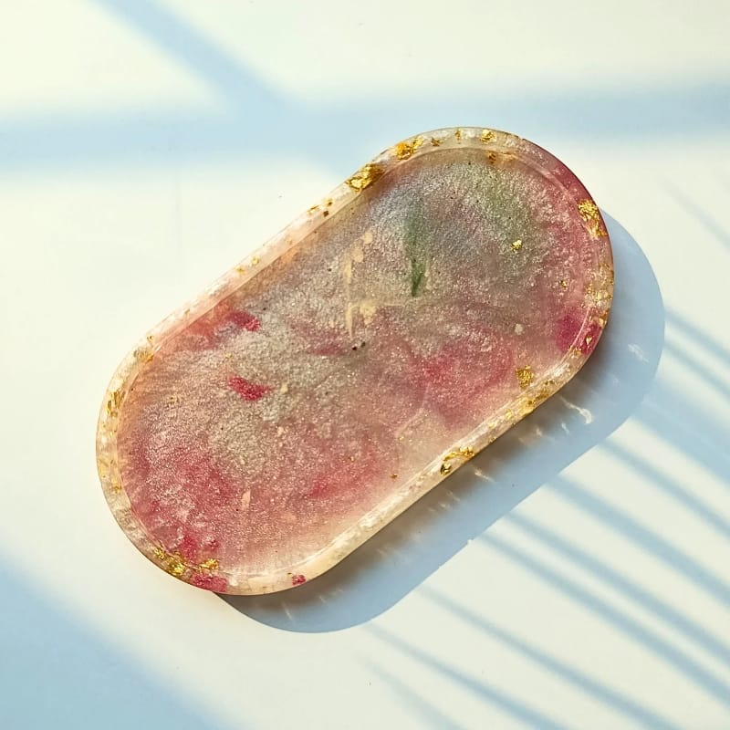 Delicate shades of pink with flecks of gold, this handmade resin tray feels like a sunset captured in your palm. Subtle yet enchanting, it’s perfect for holding jewelry, candles, or keepsakes while adding a warm, romantic glow to your space.